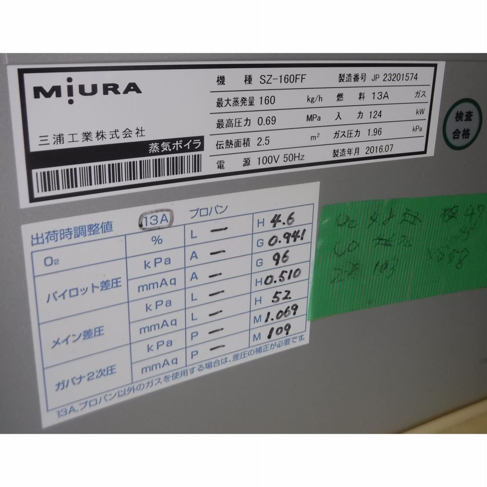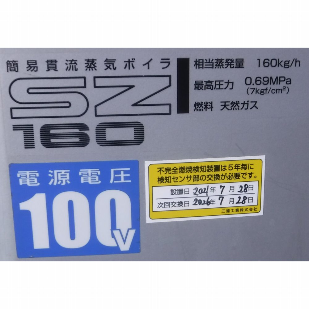 簡易貫流蒸気ボイラー 中古 三浦工業 SZ-160 50Hz 天然ガス 『品番9018』