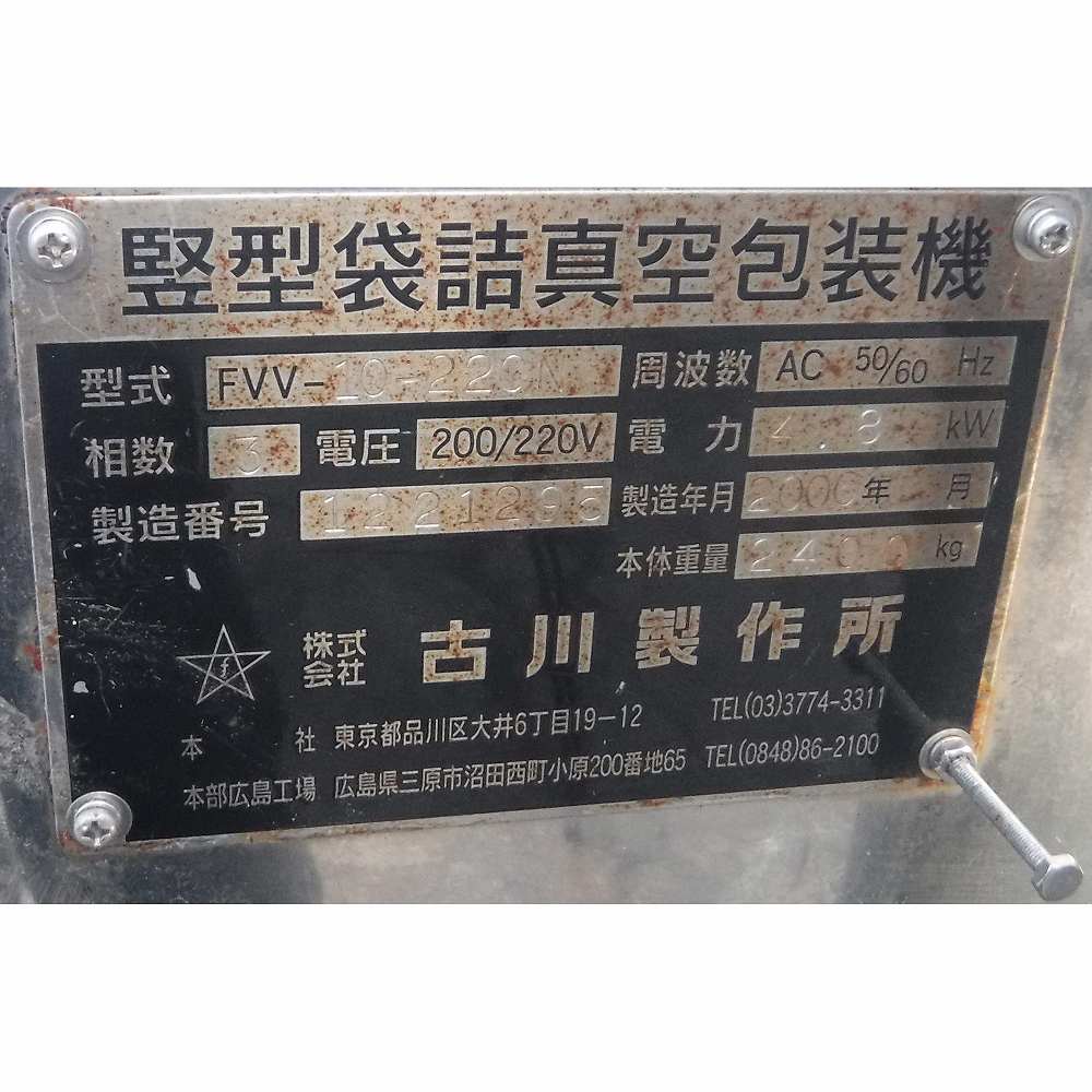 竪型袋詰真空包装機 中古 古川製作所 FVV-10-220N BUSCH製真空ポンプ 5.5kW + 5.5kW 付 『品番9080』